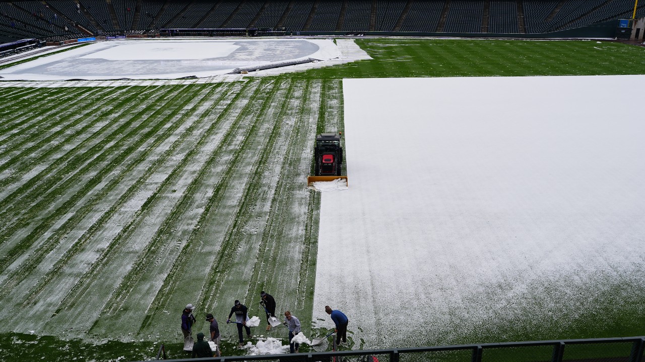 The snow stopped about three hours before the game began and Colorado’s grounds crew, which placed a tarp over the infield to shield it from the snowfall, used a plow to clear snow from the outfield. By the first pitch, it was 36 degrees and sunny — with the only remnants of snow on the pine trees behind the wall in center field.